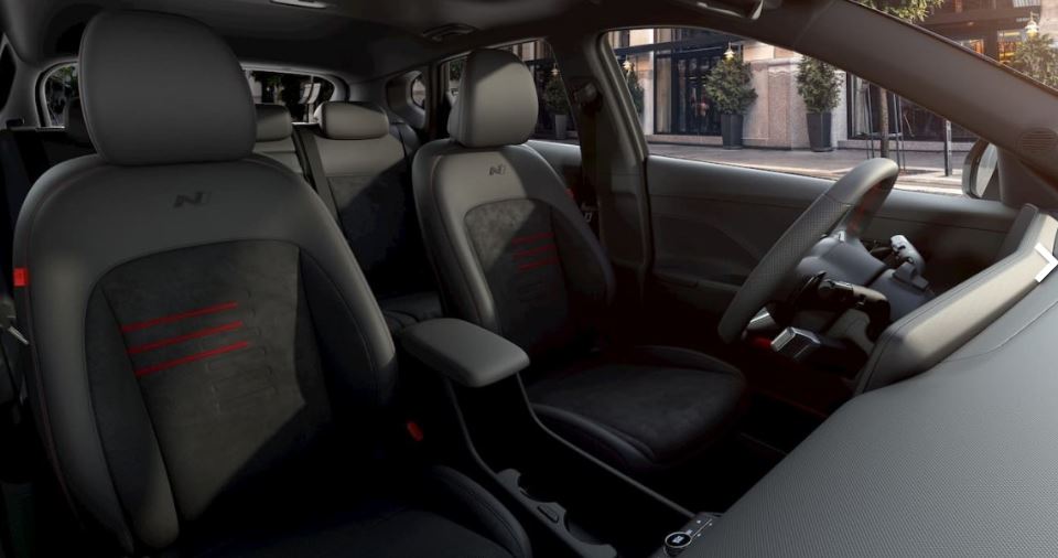 Στο εσωτερικό υπάρχουν νέα σπορ καθίσματα με κόκκινες ραφές και σήματα N Line. Οι κόκκινες πινελιές στο τιμόνι και το ταμπλό δίνουν στο Kona Electric N Line μια αίσθηση σπορ αυτοκινήτου. Υπάρχουν επίσης μεταλλικά πεντάλ N Line και γυαλιστεροί μαύροι πλαϊνοί καθρέφτες.