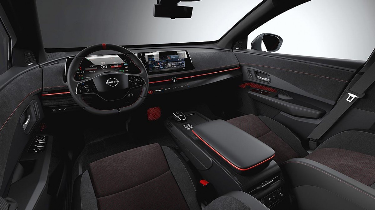 Στο εσωτερικό, τα σπορ καθίσματα Nismo με επένδυση που μοιάζει με σουέτ, τιμόνι Nismo και κόκκινες πινελιές σε όλο το εσωτερικό. Ακόμη και τα γραφικά της οθόνης του οδηγού έχουν αναθεωρηθεί ώστε να ταιριάζουν με τον προσανατολισμένο στις επιδόσεις χαρακτήρα του αυτοκινήτου.