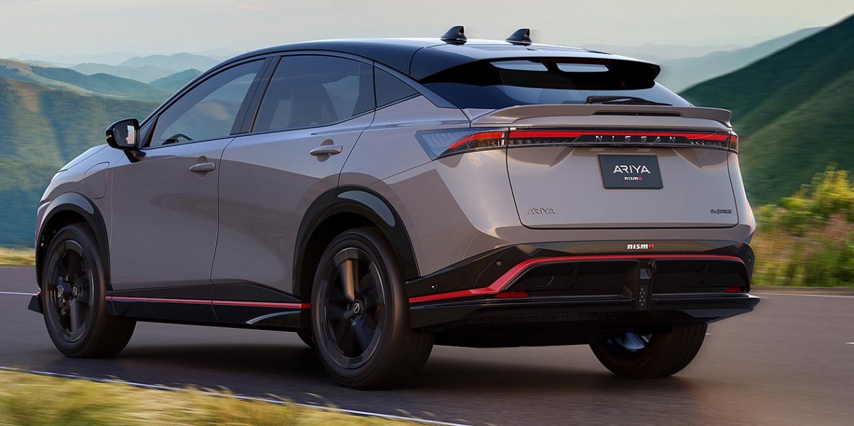 Το Ariya Nismo διαθέτει ένα μοναδικό αεροδυναμικό πακέτο που περιλαμβάνει έναν επανασχεδιασμένο μπροστινό προφυλακτήρα με εμφανή διαχωριστή και μεγαλύτερες εισαγωγές αέρα, καθώς και πίσω αεροτομή.
