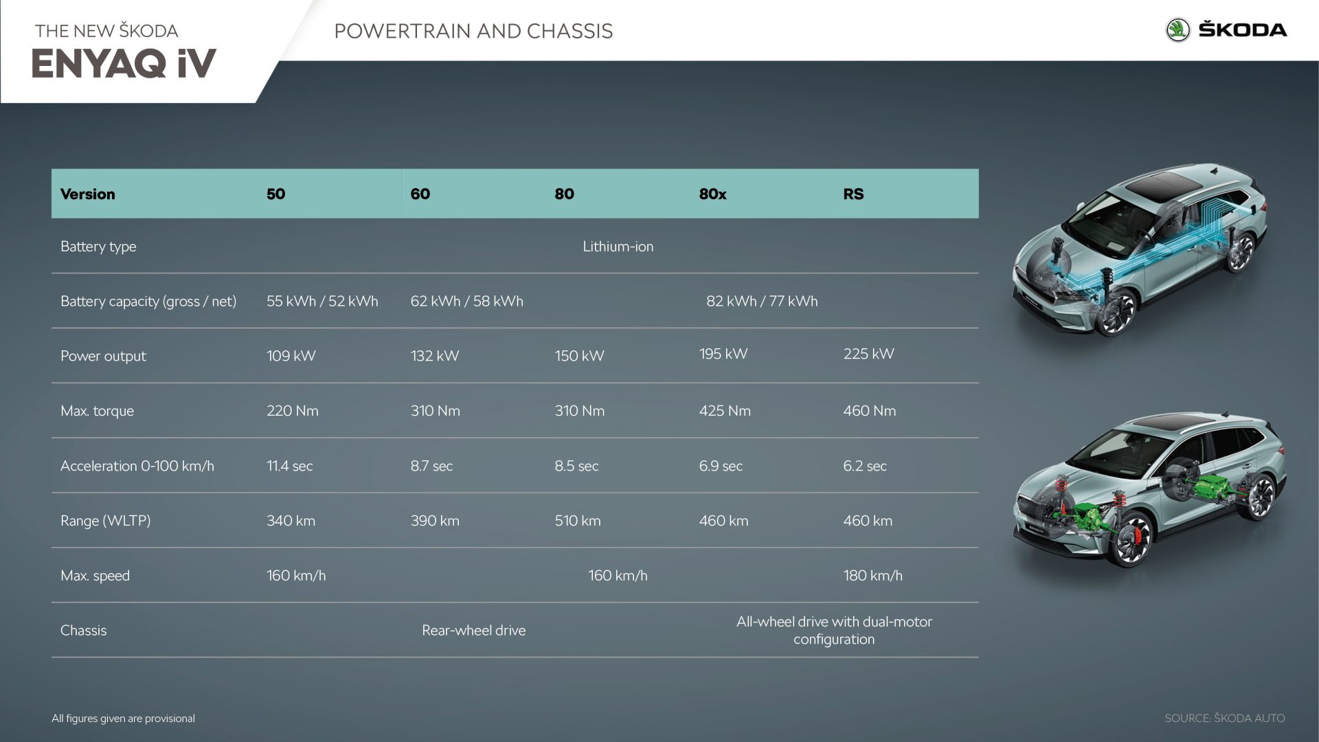 Τρεις χωρητικότητες μπαταρίας, πέντε επίπεδα ισχύος που κυμαίνονται από 109 έως 225 kW (148 έως 306 ίπποι, αντίστοιχα) και πίσω κίνηση ή τετρακίνηση, καλύπτουν πολλές διαφορετικές απαιτήσεις και χρήσεις, με αυτονομία έως 510 χλμ. στον κύκλο WLTP.