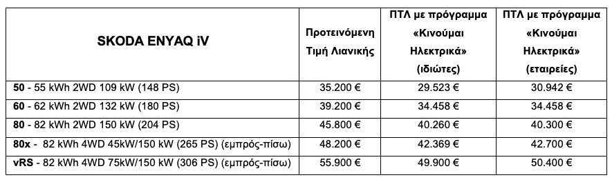 Οι Προτεινόμενες Τιμές Λιανικής – ενδεικτικές προς το παρόν, θα οριστικοποιηθούν τις επόμενες μέρες – για τo νέo Enyaq iV, για την ενημέρωση των ενδιαφερόμενων, διαμορφώνονται ως εξής (click στη φωτό):